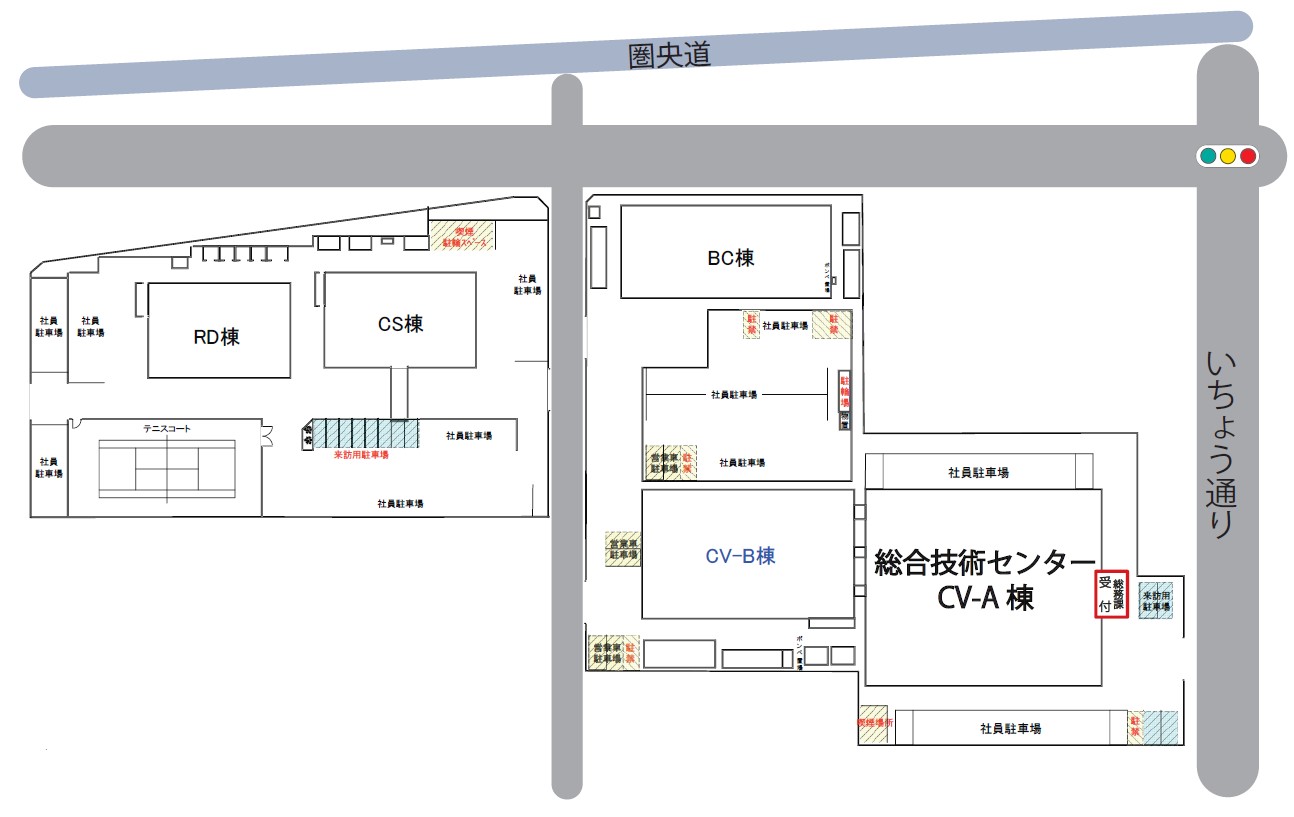 総合技術センターへ起こしの際は、赤で囲んだCV-A棟 総務課受付にて手続きを行ってください。