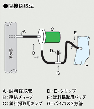 (3)導管(B)中の空気を追い出した後、クリップ(E)を開き、試料採取用バッグ(F)に試料を採取します。