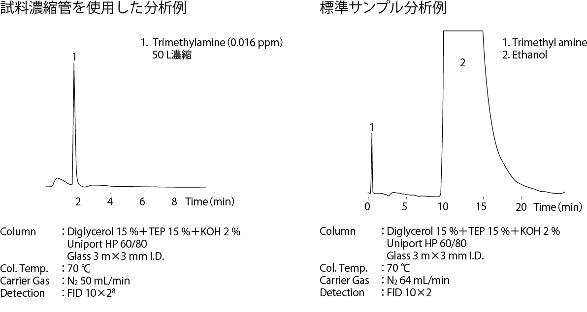 2 本のガス吸収びん中の捕集溶液を合わせて、全容50 mL のメスフラスコに移します。吸収びんの内部を捕集溶液で洗浄し、メスフラスコに洗浄液を加えて定容し分析用試料溶液とします。分析用試料溶液の一定量を注射器により採取し、分解びん中にシリコンセプタムを通して注入します。その後、窒素を0.2~0.3 L/min の流量で2~3 L 流すことにより発生するトリメチルアミンを液体アルゴンで冷却した試料濃縮管に濃縮します。