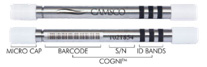 チューブの種類が一目で識別できるようにしたシステムです。IDバンドは充填剤の種類を識別用として、バーコードおよびシリアルナンバーは充填剤情報(種類、メッシュサイズ、Lot.No.など)用として印字されています。