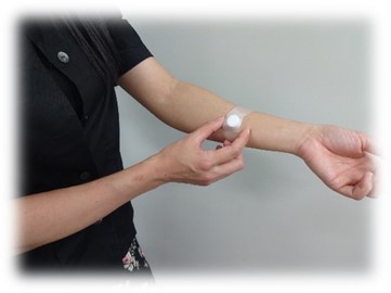 捕集パッチを運搬/抽出バイアルから取り外し、皮膚ガスを捕集したい部位に固定し捕集します。捕集後は、運搬/抽出バイアルに取り付けることで保管が可能です。取り付ける際は、医療用テープの使用をお薦めします。