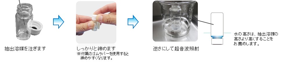 を取り付け上下を逆にし、超音波照射による溶媒抽出を行い、捕集成分を溶媒へ抽出します。