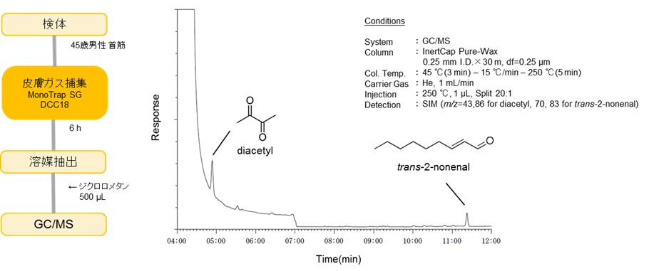 45歳男性の首筋にMonoTrap SG DCC18を取り付け皮膚ガスを捕集した後、超音波照射による溶媒抽出を行い、GC/MSにて測定した結果です。