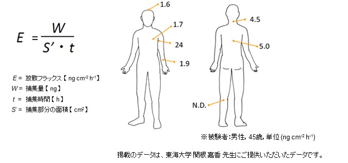GC/MS分析で得られた捕集量W(ng)から、捕集時間 t (h) とMonoTrap SG DCC18 の面積S(cm2)より、各成分の放散フラックス量 E が求められます。身体の各部位ごとにジアセチルの放散フラックスを測定した結果です。部位により、ジアセチルの放散フラックスの値が違うことがわかります。