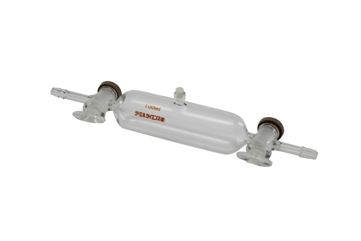 パイレックスガラス製の容器の両端には、90度回転ガラスすり合わせバルブがついています。外筒中間部のセプタムは、シリンジ採取用です。