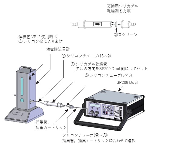 大気サンプリングポンプ用キャリブレーション乾燥管キットは、精密膜流量計から発生する石ケンをトラップします。左図のように基準流量計の出口とサンプリングポンプ本体の吸引口を接続し直接流量校正を行えます。