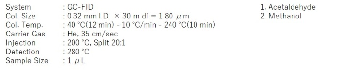 日本薬局方エタノール(消毒用エタノール)分析【試験】についてのデータ比較です。InertCap 624 for Ethanolのカラムを使用したデータでは、日本薬局方に規定されているエタノール中のアセトアルデヒドとメタノールの分離度1.5以上を大幅にうわまわった結果となりました。