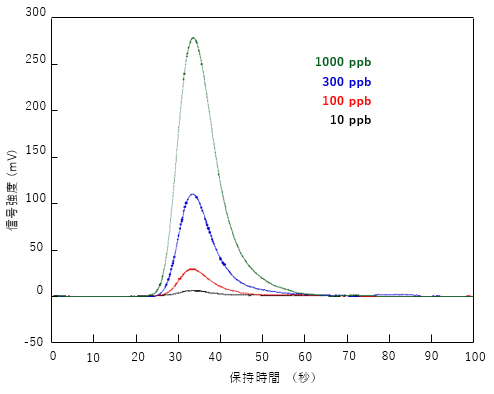一般のGC分析とは異なり、SGC ではピーク高さ(=信号強度)を用いて定量を行なっています。