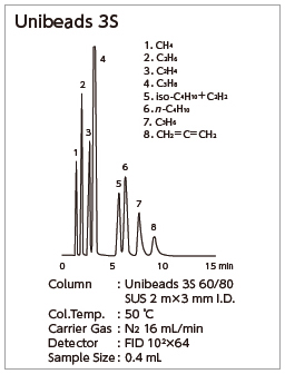 Unipak Sは球状シリカゲルベースでエタン、エチレン、アセチレンの分離、また昇温分析により炭素数の高い炭化水素ガスも分析できます。