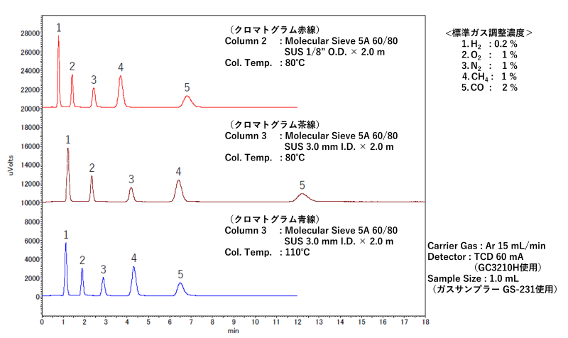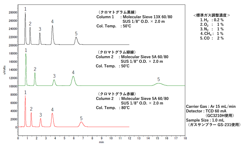 パックドカラムで用いられるモレキュラーシーブには、5A型および13X型があります。5A型は一般的に保持力が強く、使いやすいという利点がありますが、COの保持が過剰になりやすいという欠点があります。その場合には、カラム温度を調整することで、13X型と同等の分離性能を得ることが可能です。