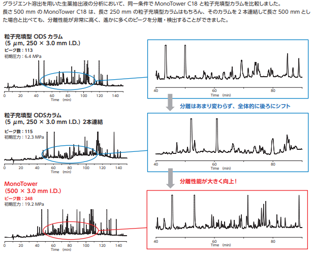 カートリッジにスルーポアとメソポアの二重ポア構造をもつ円柱状のシリカ連続体(シリカロッド)を分離担体とした HPLC用シリカモノリスを用いているため、低いカラム背圧を維持しつつ高分離能を得ることができます。
