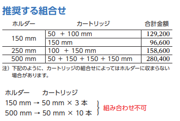 - カートリッジ (50、100、150mm)を組み合わせて使用可能→最長500mmまで連結可能