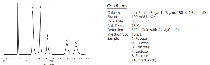 InertSphere Sugar-1は、4級アンモニウム基結合ポリマーを充填した糖分析用陰イオン交換カラムです。また、電気化学検出器(ED723など)と組み合わせることで、糖類の高感度分析が可能となります。単糖・二糖類の分析に適しています。