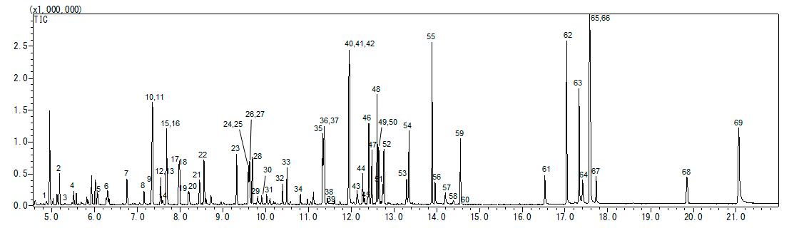 GC・GC/MSメタボロミクス用代謝物質混合試料を、乾固後メトキシム化とTMS化し、GC/MSで測定することにより、次のようなTICCが得られます。