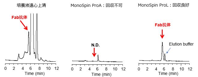 MonoSpin ProAで培養液をCHO細胞培養液を精製した後に、パパイン処理を行い、Fab領域とFc領域にモノクローナル抗体が分離していることを確認後、MonoSpin ProLを用いることでFabを回収、精製することが可能です。