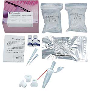 ジーエルサイエンスでは、リン酸化ペプチドと特異的に吸着する二酸化チタンを用いた精製・濃縮ツールを用意しています。