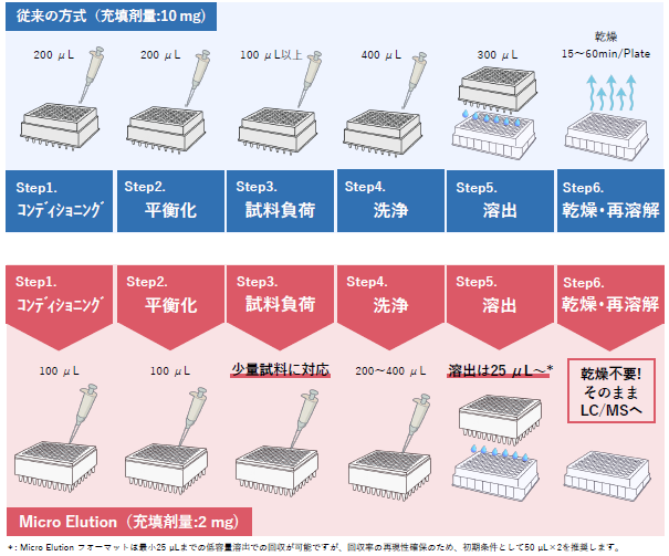 - 標準条件で100 μL、最適化により25 μLまでの低溶出量での回収が可能です。 溶出液中の濃度を高めることで、LC/MS などでの検出感度向上に寄与します。