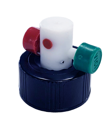 ミニナートバルブは取り扱いにくい揮発性の液体や通常のセプタムでは傷みやすい試料などのためのシールバルブです。試料と接触する部分にはすべて PTFE が使われているため薬品に対しても安全です。シリンジで試料を採取するには、緑のボタンを押してバルブを開き、頭頂部より針を刺し入れればよく、採取して針を抜いた後に赤のボタンを押しておけばシールされます。