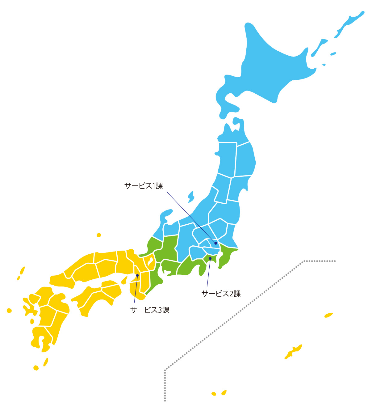 全国3ヶ所のサービス拠点を中心に、メンテナンスや修理、技術サポートに迅速に対応できる体制を整えています。