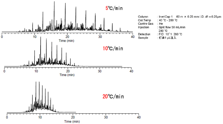 昇温法では、同族列の化合物の溶出順序は変わりませんが、多成分混合試料では溶出順序が変わることがありますので注意が必要です。