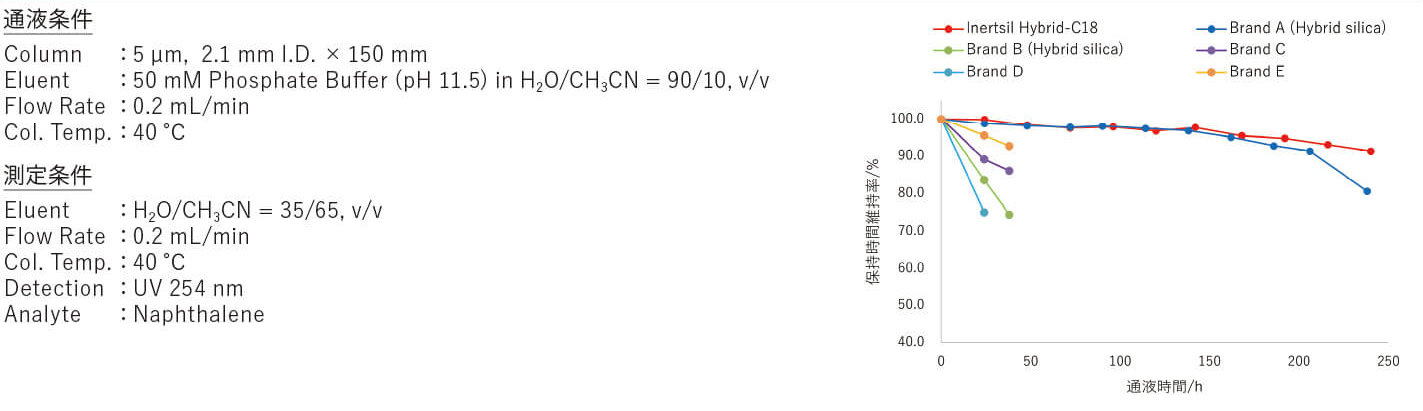 新たに開発した全架橋型ハイブリッドシリカゲルを採用し、今までにない不活性度を実現したODSカラムです。水100%溶離液で使用できることはもちろん、今までのシリカゲルに比べ、過酷なpH条件(pH12)や高温下でも安定した性能を発揮します。メソッド開発の自由度が高く、多様な分析ニーズに柔軟に対応する、『次世代のファーストチョイスカラム』です。