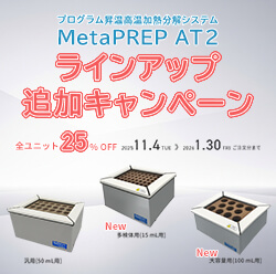 期間 11月4日(火) ~ 1月30日(金)MetaPREP AT2新ラインアップ追加キャンペーンMetaPREP AT2は、ヒートブロック型の酸分解装置です。従来のホットプレートに比べて、効率的な酸分解を実現します。
